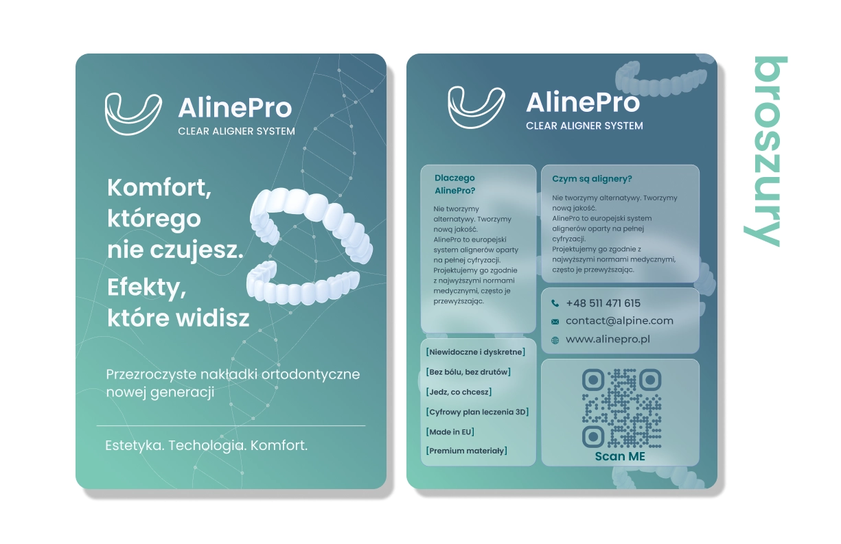 A unique logomark was designed, combining a fluid "A" with the shape of an aligner to represent flexibility and precision.